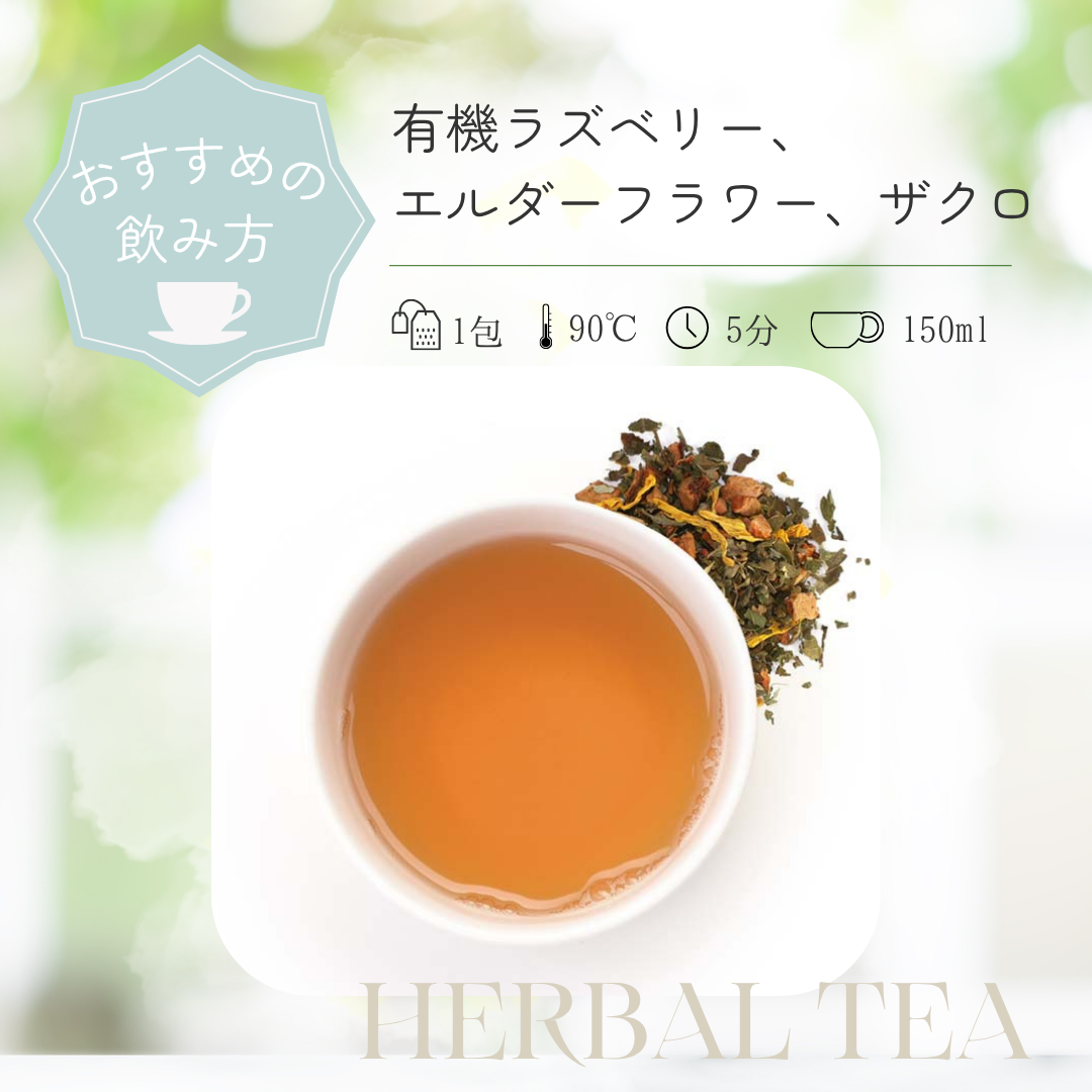 フランスから届いた、心華やぐオーガニック ハーブティー。 カップに注いだ瞬間、エルダーフラワーの やさしく華やかな香りがふわっと広がります。 一口飲むと、りんごの自然な甘みをベースに、ラズベリーとザクロのフルーティーな酸味が 重なり、まるでデザートのような満足感。 甘いものを食べたいけれど我慢したい時に おすすめです。