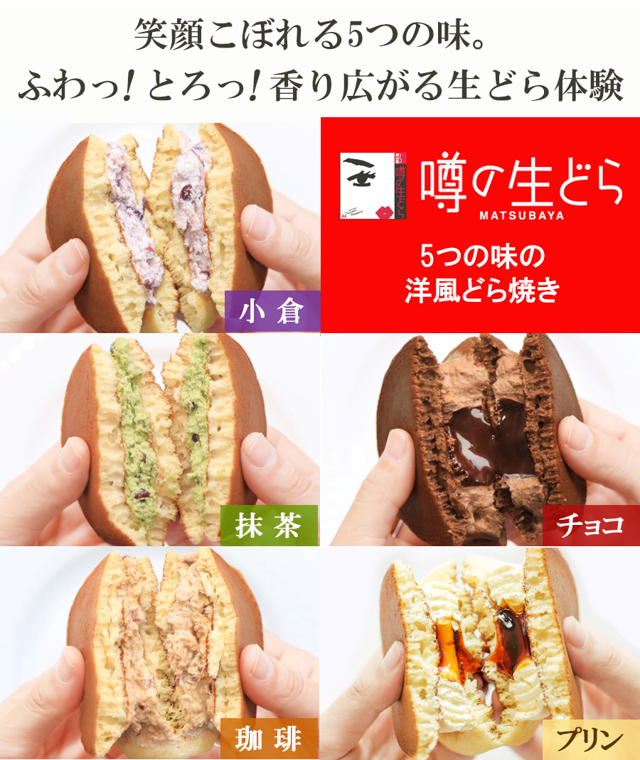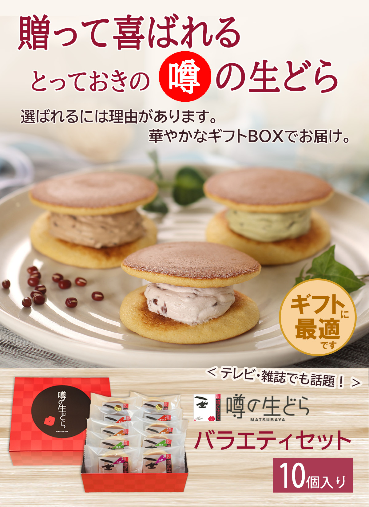 当店の「噂の生どら」は偶然の配合ミスから生まれたふわふわの生地で、松葉屋特製クリームをサンドした洋風どら焼きです。 小倉、抹茶、珈琲、チョコ、プリンの5つの味が2個ずつ入った10個入りの詰合せギフトです。プレゼントにおやつに自分へのご褒美に、様々な用途にお使いください。 真心こめて作った生どらを、島根の奥出雲から冷凍でお届けします。