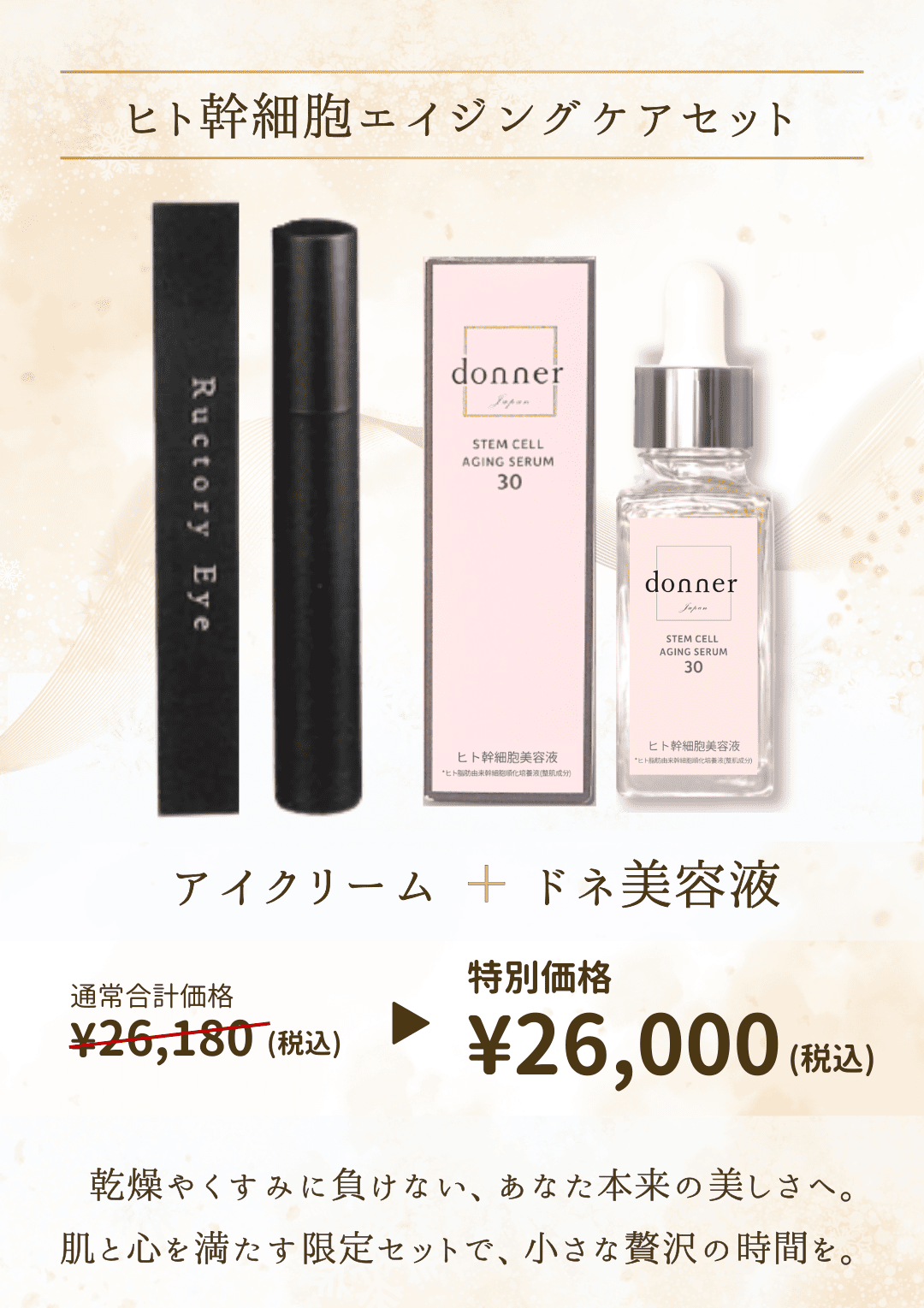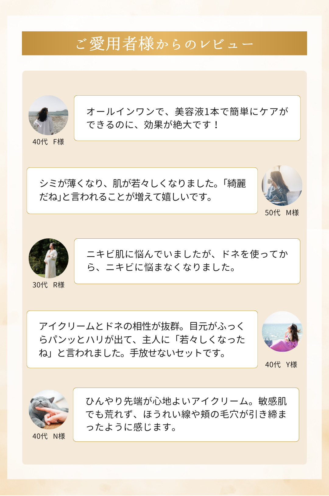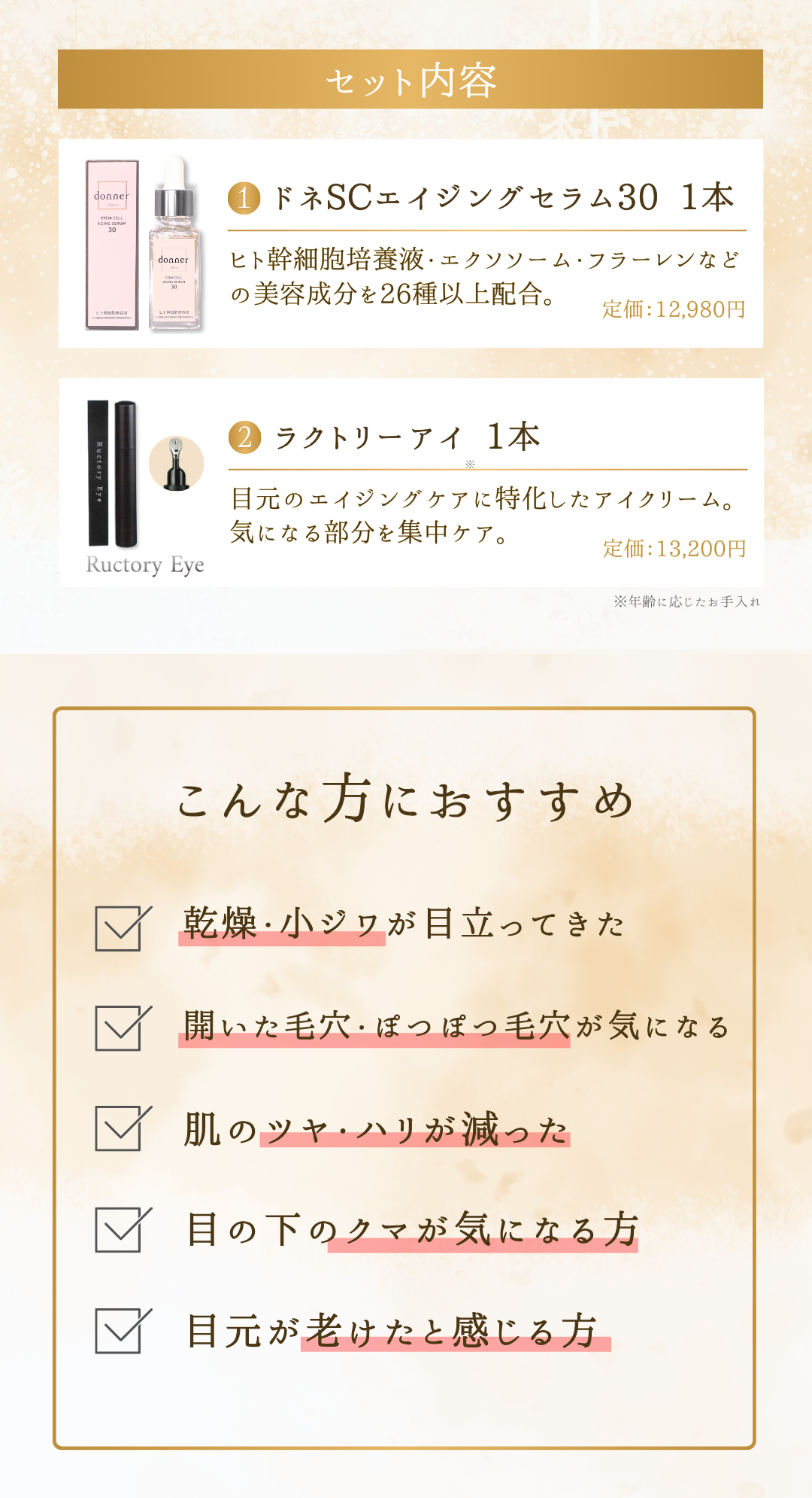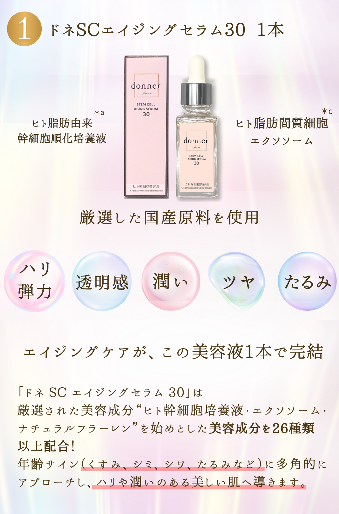 主要成分であるヒト脂肪由来幹細胞順化培養液、 ナチュラルフラーレン、 エクソソームが、肌のハリ・ツヤ・うるおいをしっかりサポートし、年齢による悩みに効率的にアプローチします。