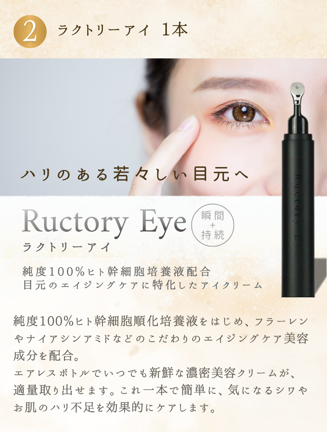 【使用方法】1.ラクトリーアイを1プッシュ程度、片目の周りや、引き上げたい箇所に塗布します。2.指の腹を使い、やさしくとんとんと肌になじませます。3.引き上げたい方向へ優しくゆっくりなじませてください。