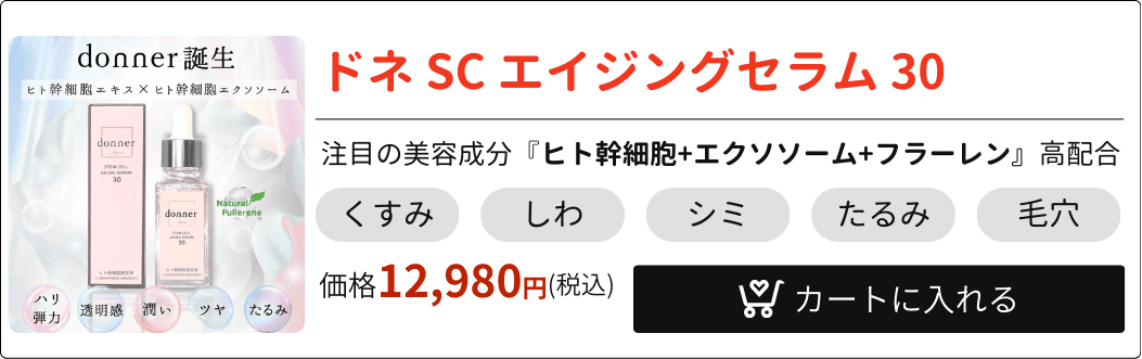ヒト幹細胞美容液「donner(ドネ)SC エイジングセラム 30」は、純度100%のヒト幹細胞培養液をはじめ、ビタミンCの約250倍の抗酸化力を持つナチュラルフラーレンを高濃度で配合。さらに、近年注目されている美容成分「エクソソーム」も取り入れた、贅沢なエイジングケア美容液です。