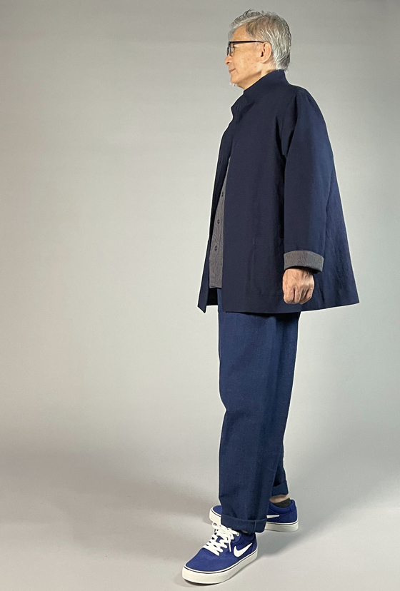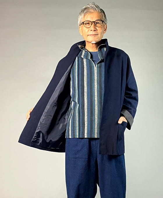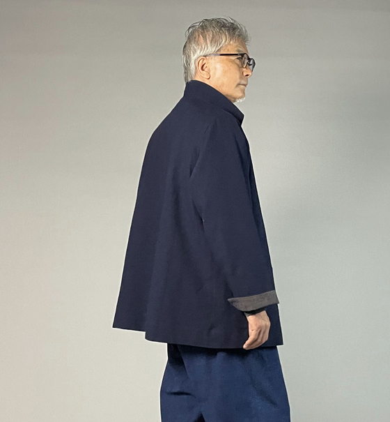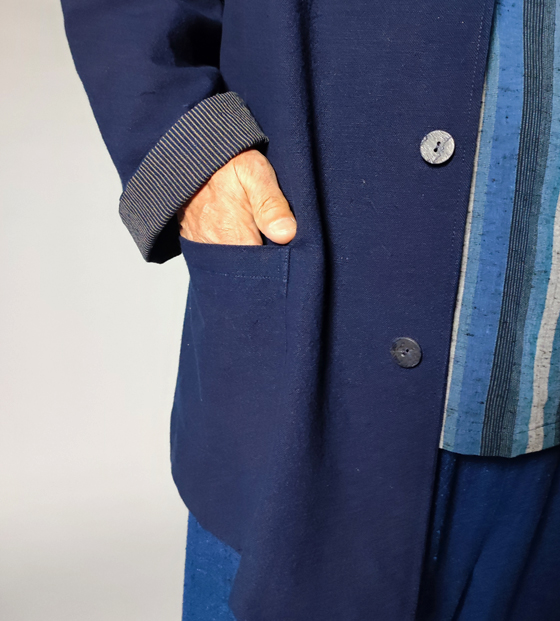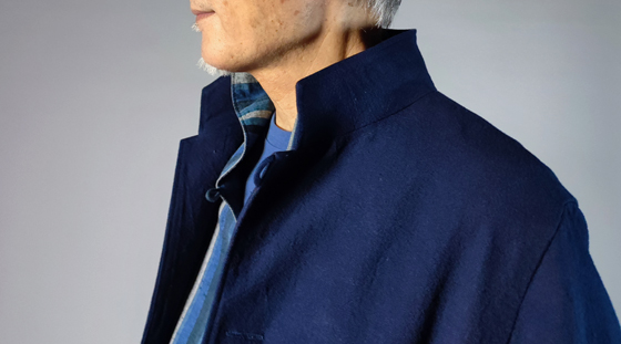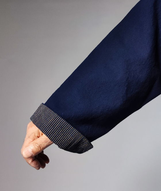 袖口の見返しは備後・柿渋藍染めの縞を配しておしゃれなアクセントになっています。
