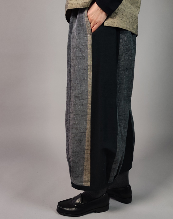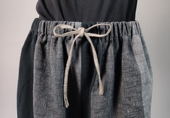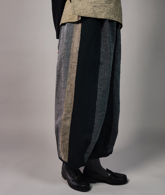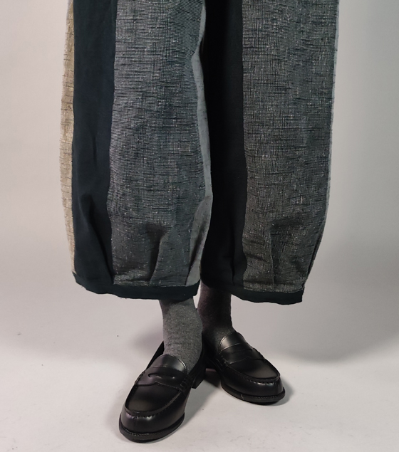 どの角度から見ても、縞の配置が違って見える楽しいパンツです。