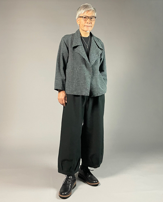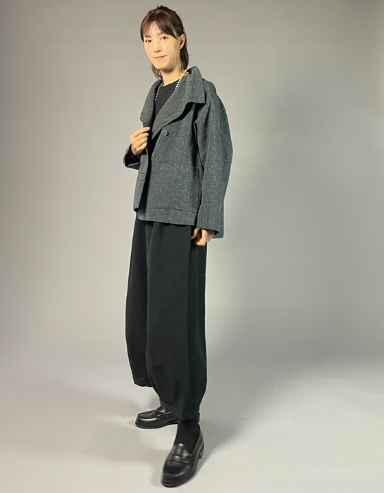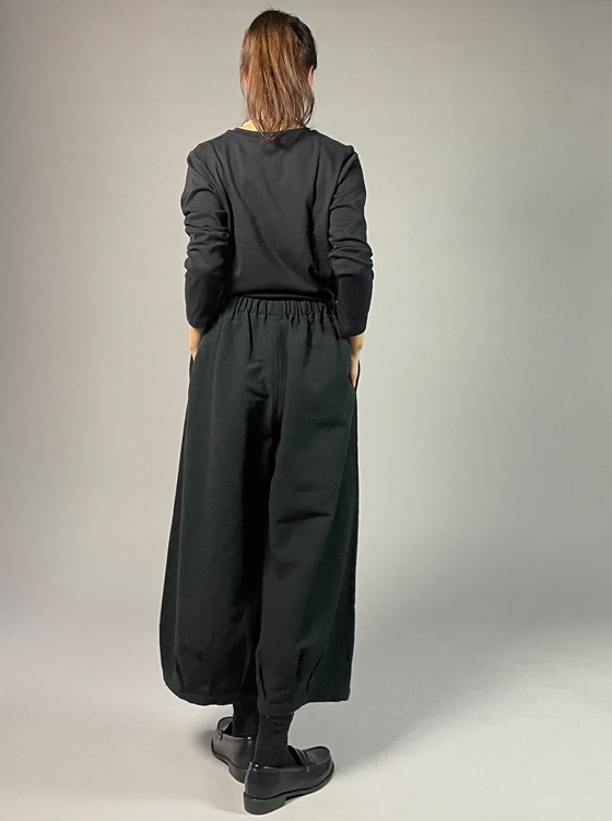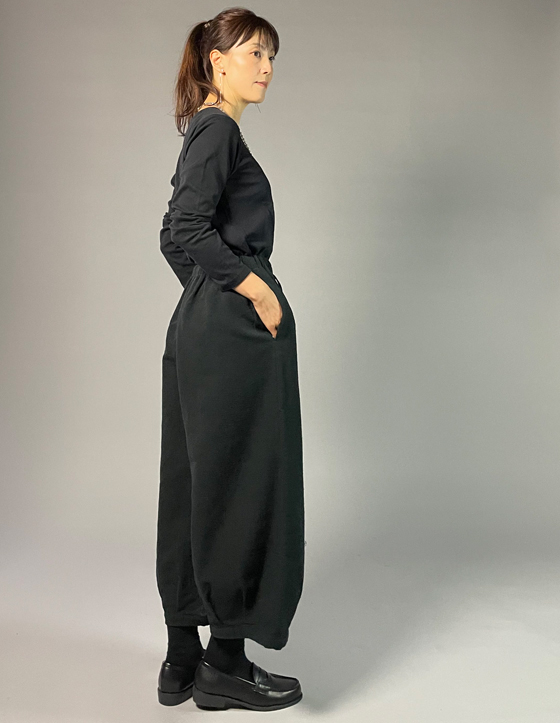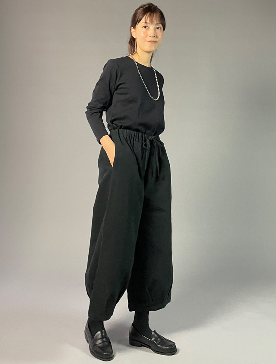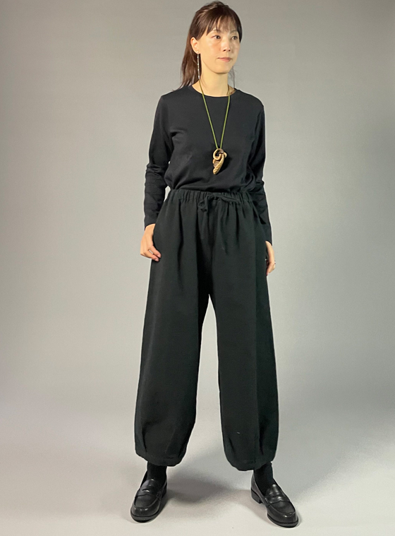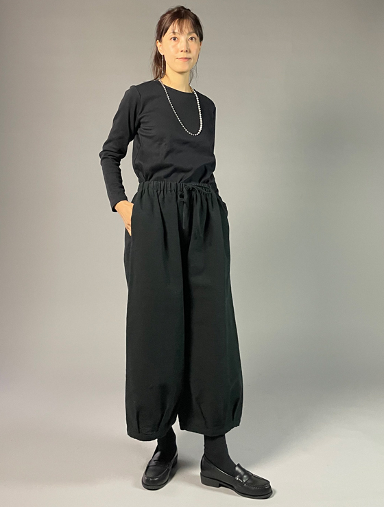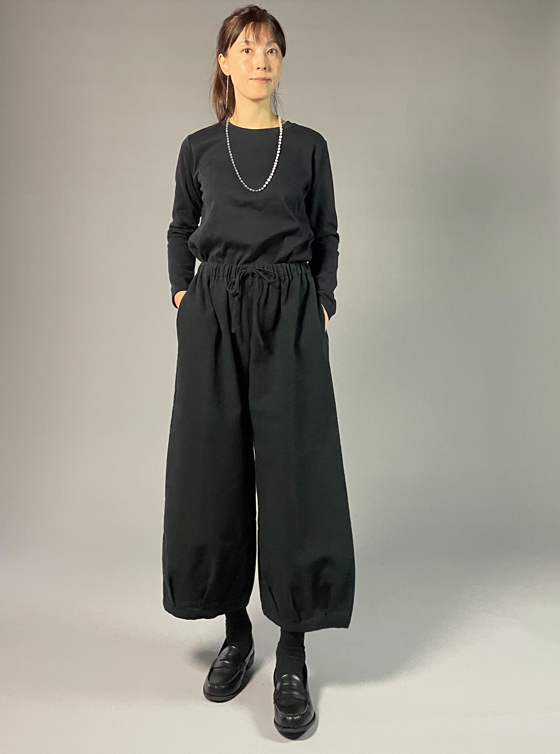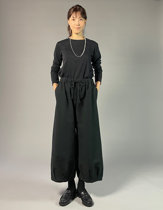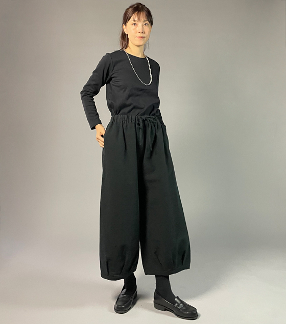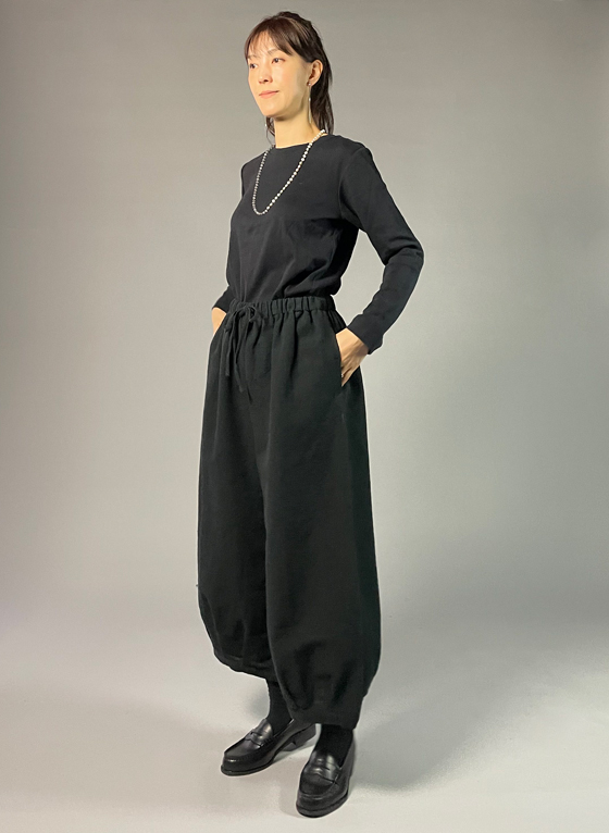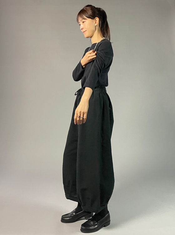 全体的にゆとりのある幅広のパンツで、すそにタックを入れてバルーン感を出しています。