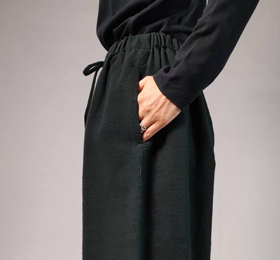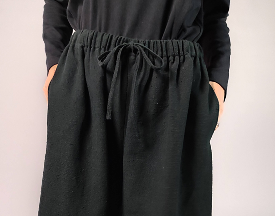 遠州綿紬のざっくりした感触の綿麻きもの地・黒で作りました。