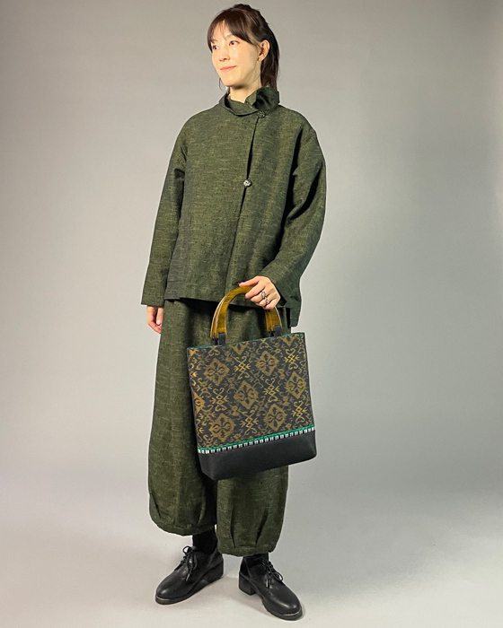 縦糸に黒と横糸に緑色の糸を配して、苔色のような深い草色を表現しています。