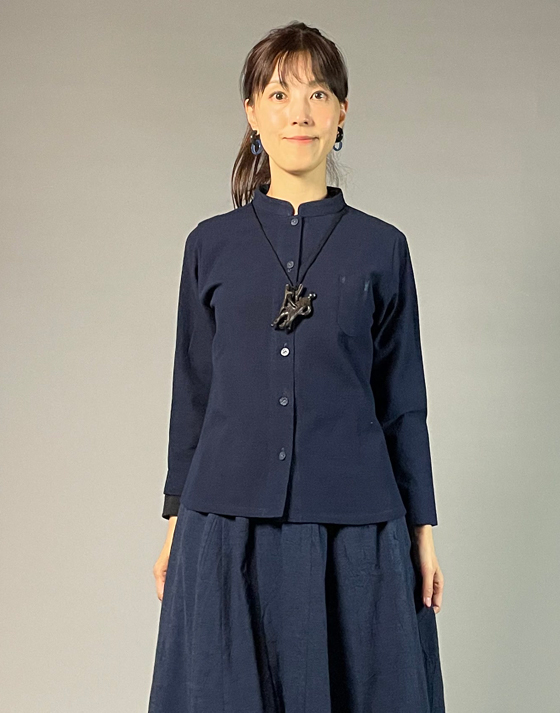 ベーシックなデザインのスタンドカラーのシャツブラウス。