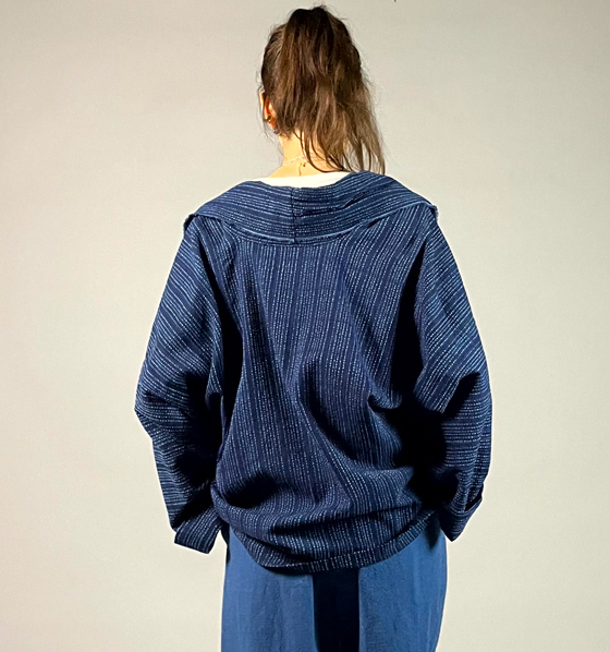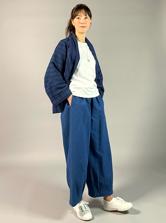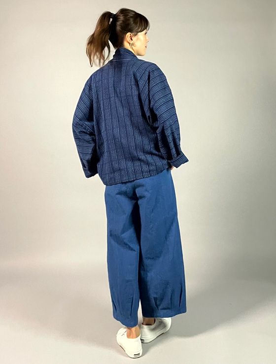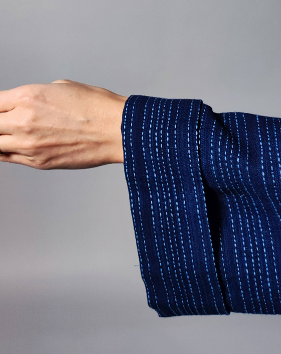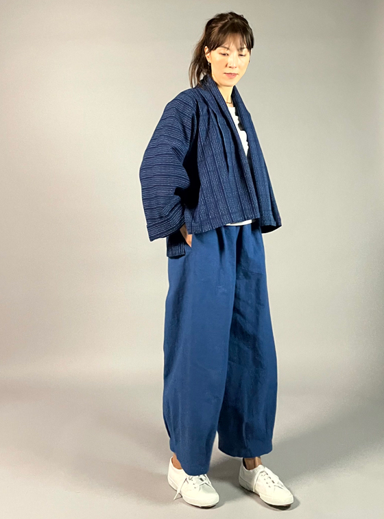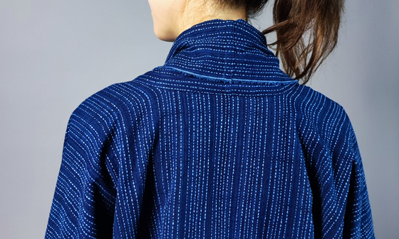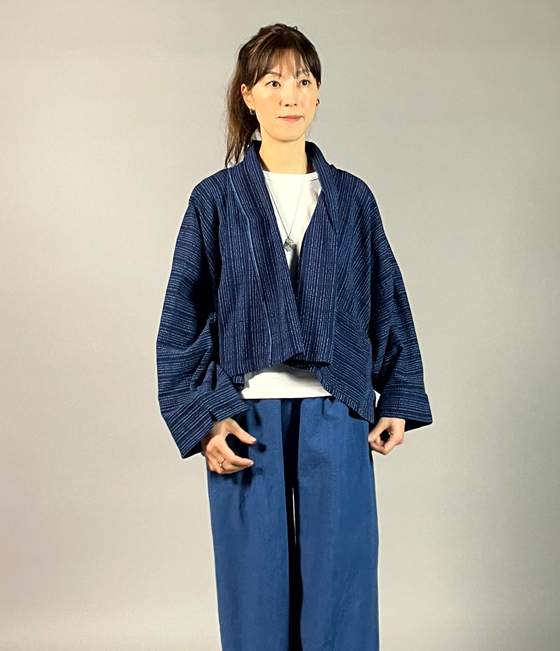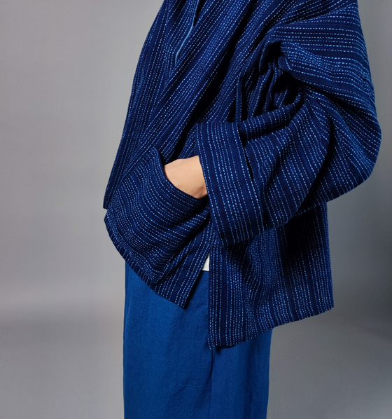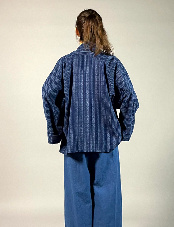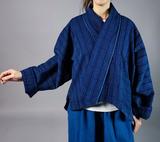 生地は遠州木綿の藍染めの刺し子織り。