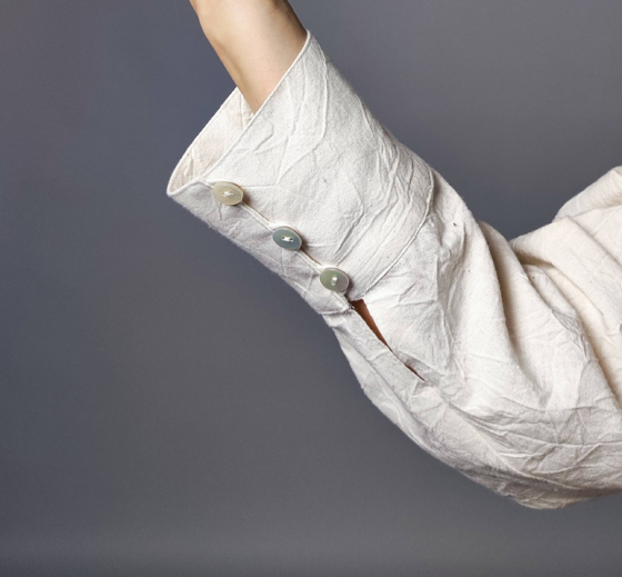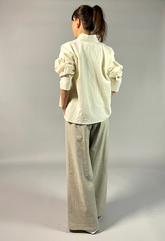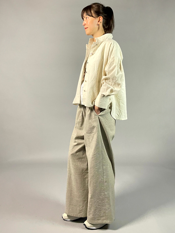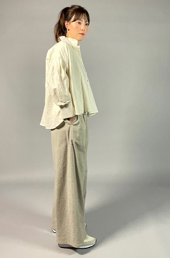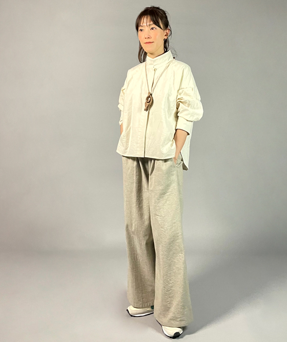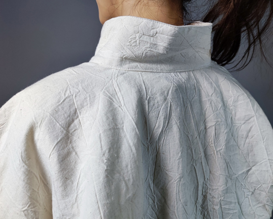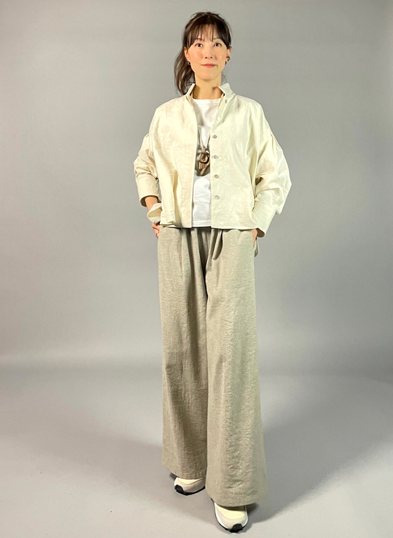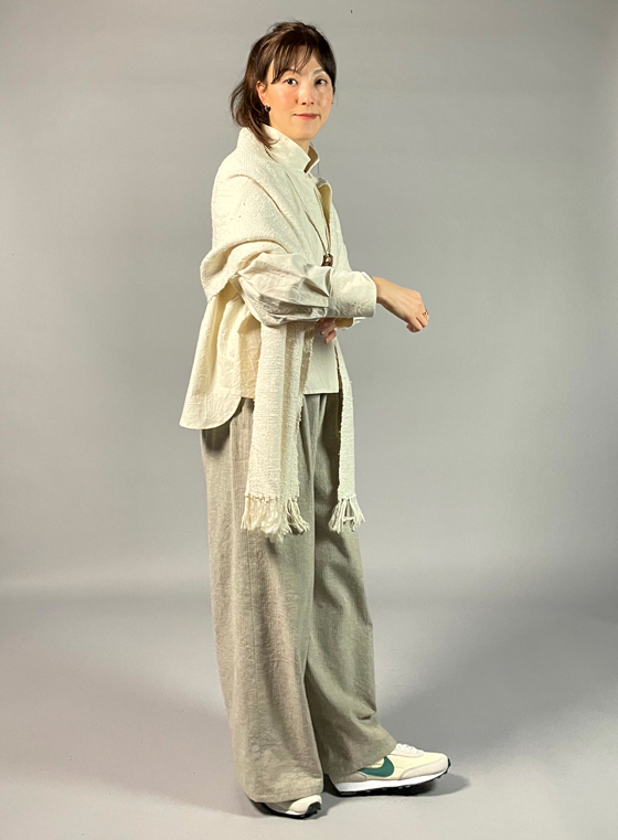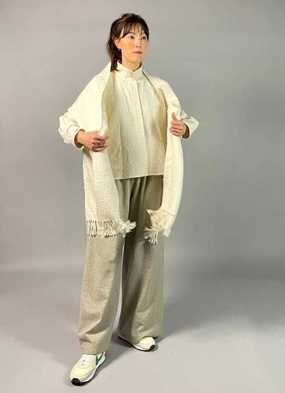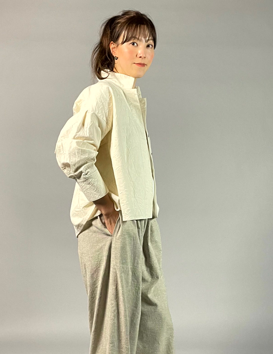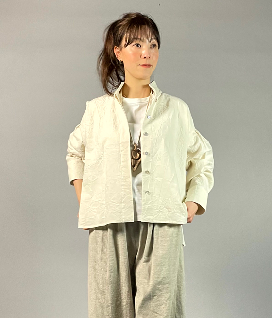 生地は新潟・亀田縞のワッシャー加工地。卵色がかったオフホワイトがきれいです。