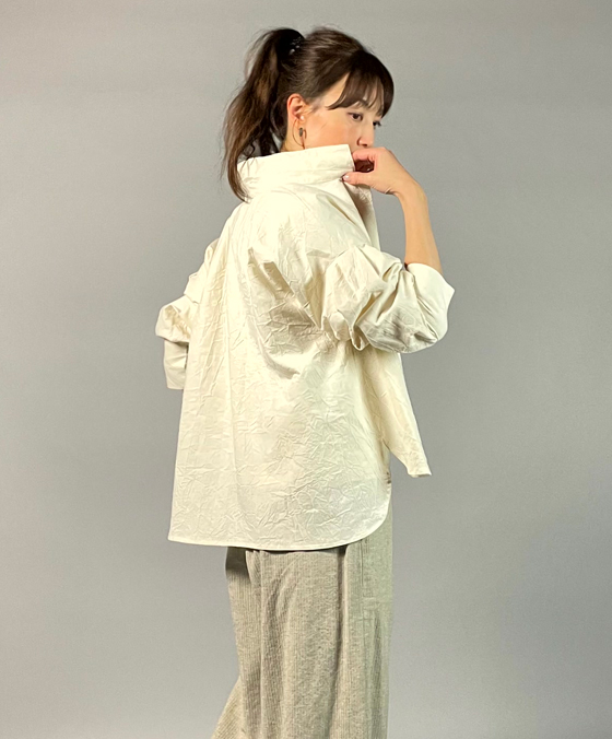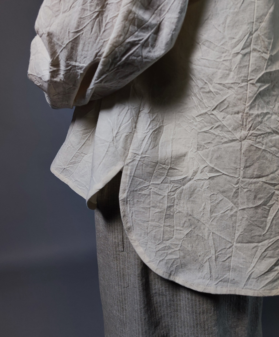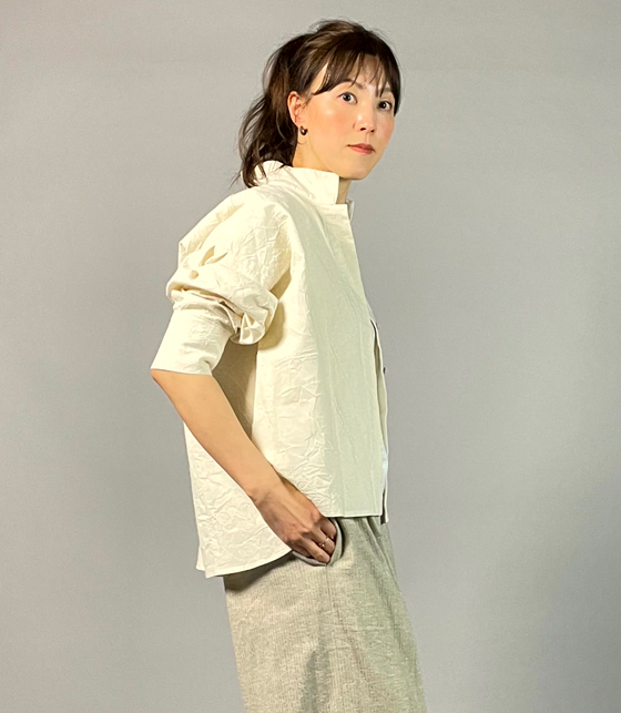 ニュアンスのあるオフホワイトが印象的なブラウス。新潟・亀田縞のワッシャー加工の生地で作りました。![]()