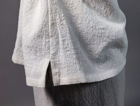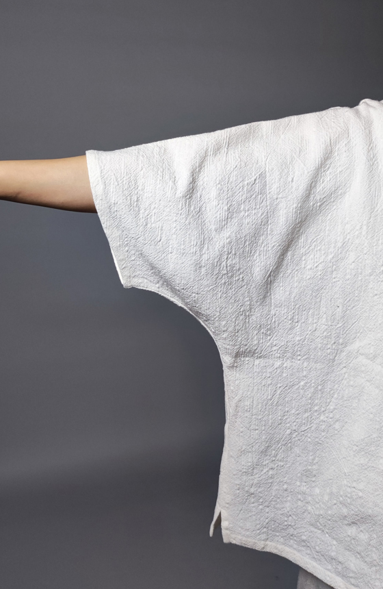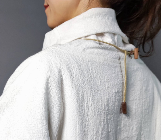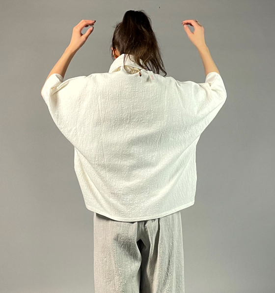 生地は備後・生成り白のスラブ地です。凹凸のある節糸を織り上げ、その後井戸水で洗いをかけているので陰影のある表情が楽しめます。
