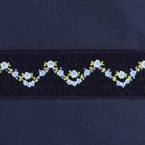 清楚で落ち着いたブルー系の小花刺繍をアーチ状にあしらった上品なデザインです。