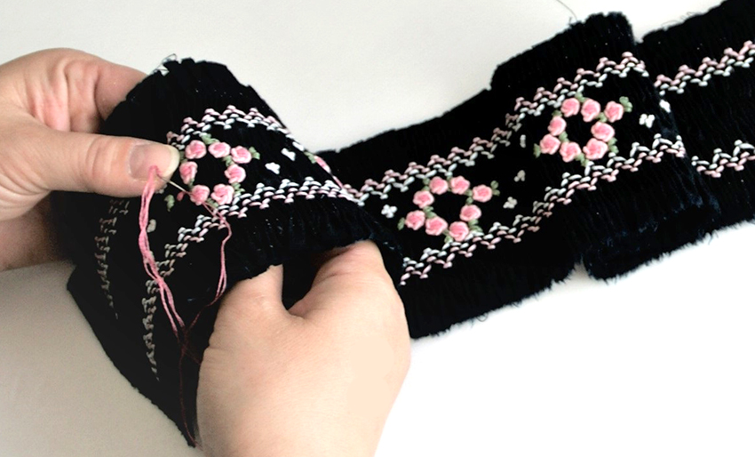 華やかなピンクのローズ刺繍をふんだんに散りばめました。
