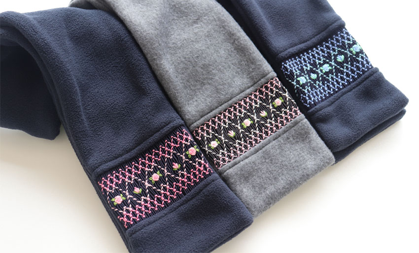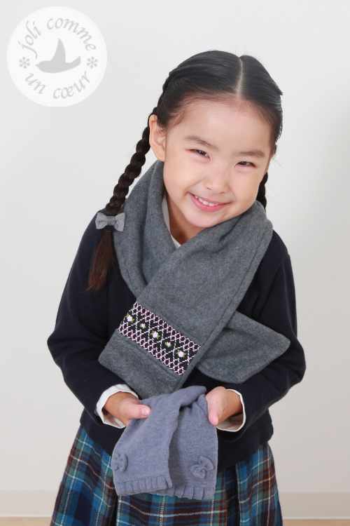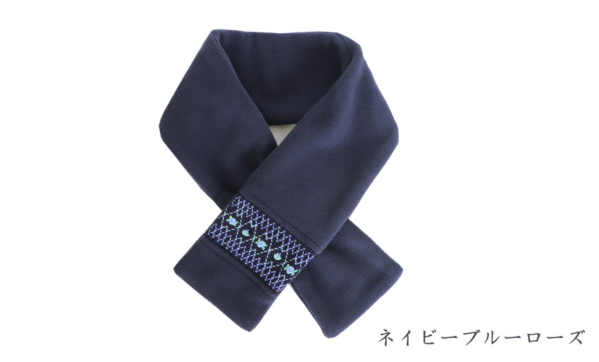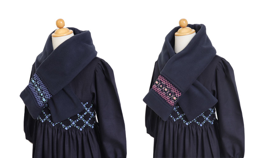 スモッキング刺繍を施した上品なフリースマフラー。軽くて暖かく通園通学に最適です。ギフトにもお勧めです。