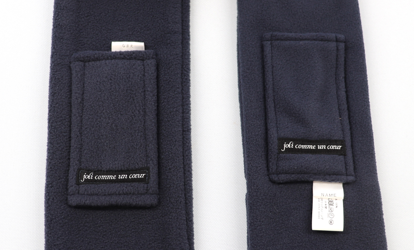 背面のループに通してクロスさせるだけので、簡単に着用いただけます。内側にお名前がきちんと書けるタグ付きです。