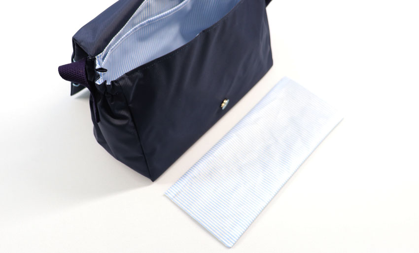内側は水色ストライプのPVC(ビニールコーティング)加工を施した綿100%です。