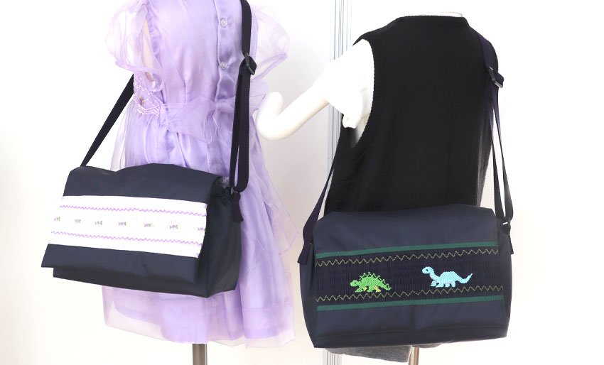 スモッキング刺繍または手刺繍をふた部分にあしらったショルダーバッグです。