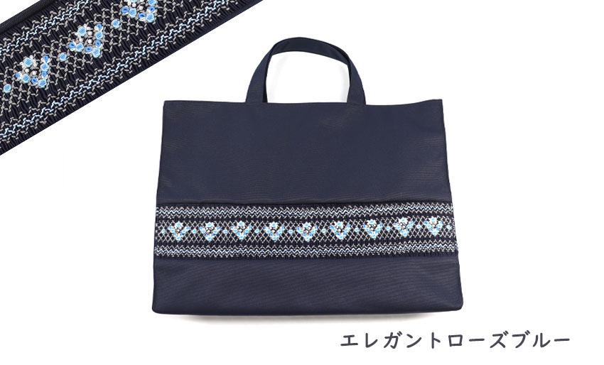 ネイビーの弱撥水加工を施したポリエステル素材にスモッキング刺繍をあしらい上品に仕上げています。裏地にはナイロンを使用し、汚れも目立ちにくく荷物の出し入れもスムーズに行えます。内側にお名前白タグつき。