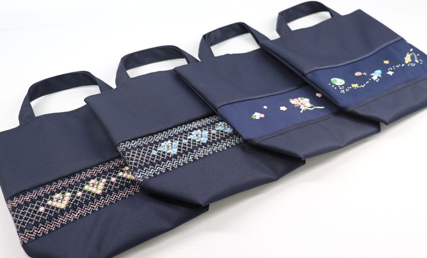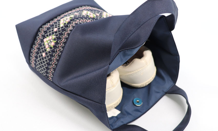 ネット限定販売のスモッキング刺繍・手刺繍入りシューズバッグです。