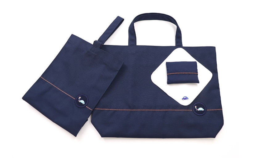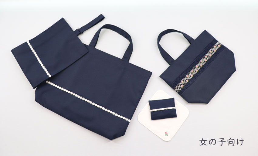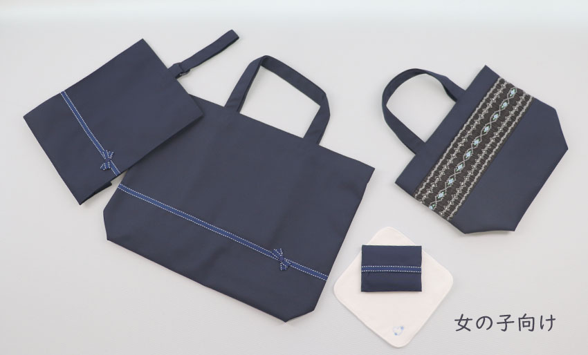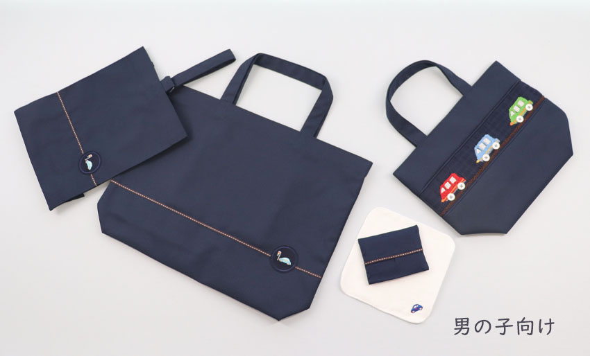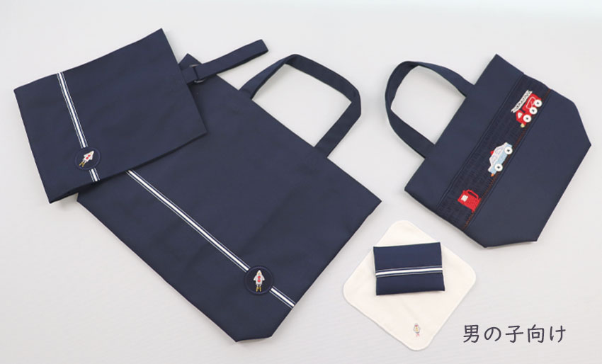 一枚仕立てのレッスンバッグ・横マチのあるシューズバッグ・ポケットに納まりやすく小ぶりで使い勝手のよいミニティッシュケースとワンポイント刺繍が可愛いらしい白地の15㎝サイズのタオルハンカチが入っています。![]()