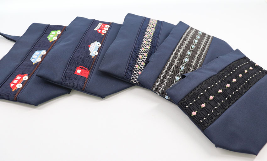 レッスンバッグ1、シューズバッグ1、スモッキング刺繍入りミニバッグ1、タオルハンカチ1、ミニティッシュケース1