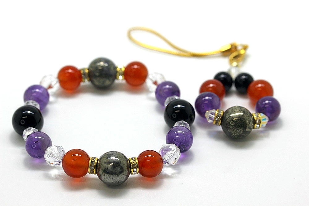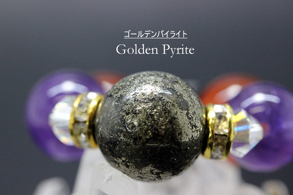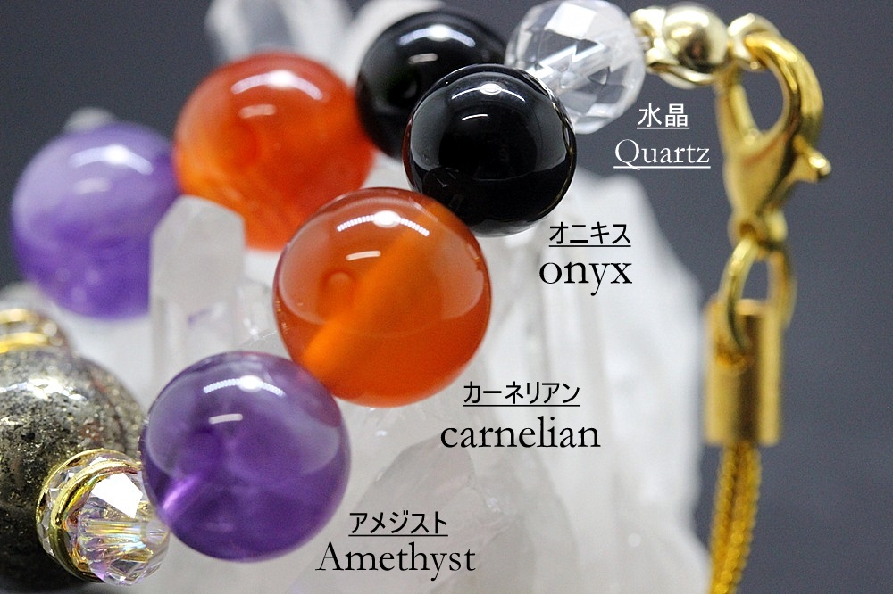 使用石:ゴールデンパイライト 約12mm×1石/オニキス 約8mm×2石/カーネリアン 約10mm×2石/アメジスト 約10mm×2石/水晶 約6mm×1石